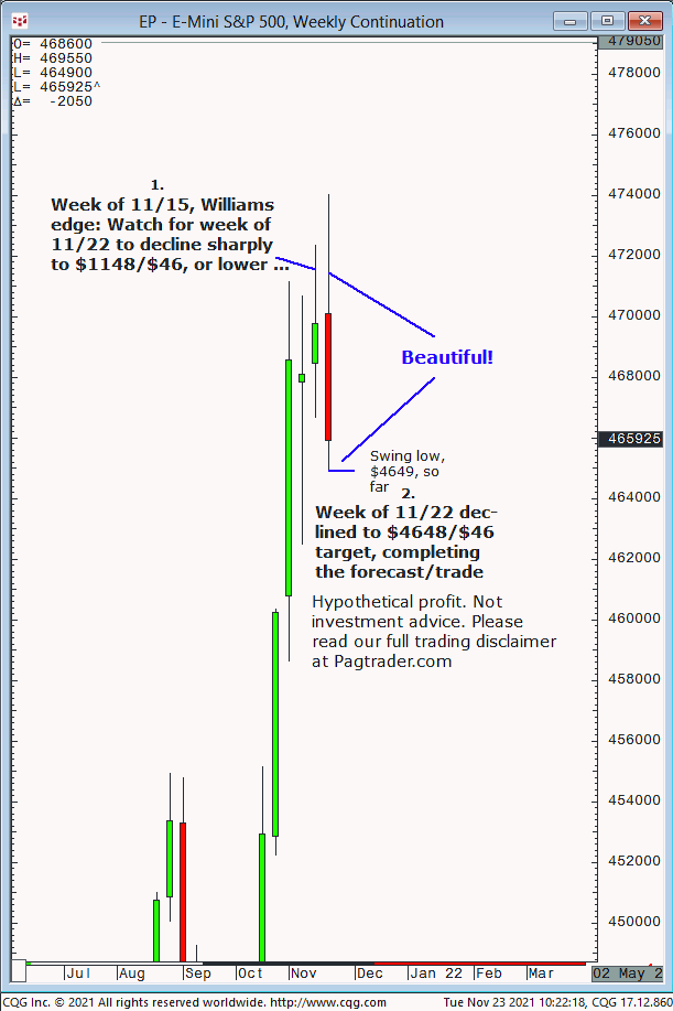 Fri., 11/19: Failure to close weekly above $4712 will prompt decline to $4590/$85 or lower by week of Dec., 6. Result? S&P was unable to close weekly above $4712 and completed the $4590/$85 target!