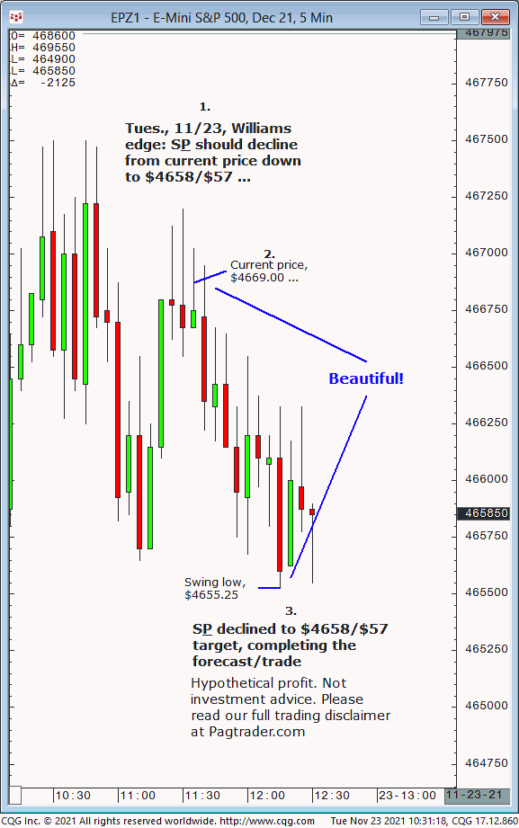 Tues.,11:23: S&P should decline from current price of $4669 down to $4658/$57. Results? The S&P declined from $4669 down to $4658/$57!