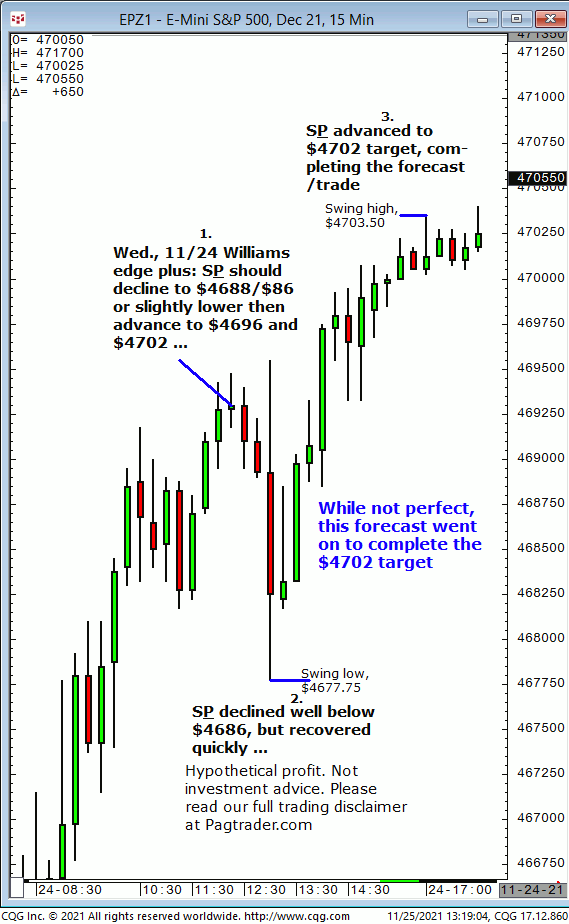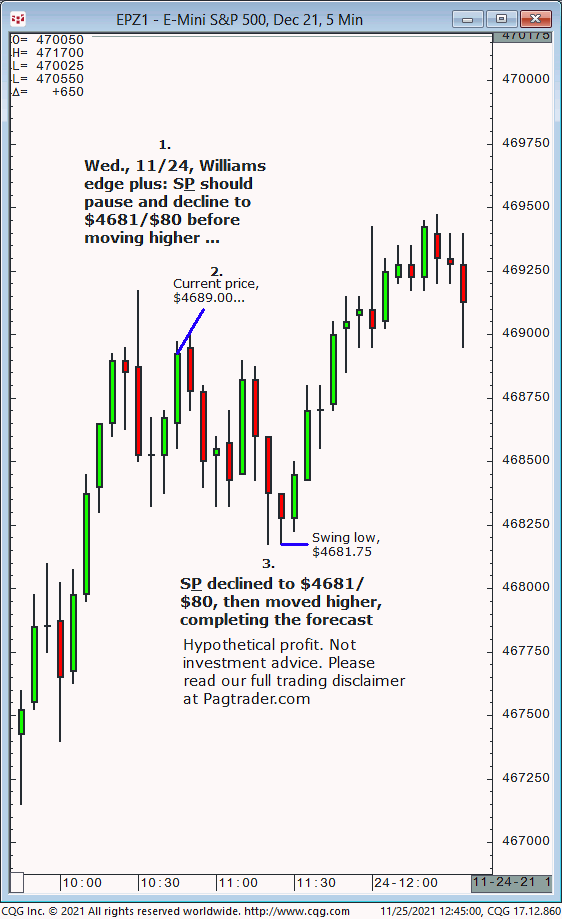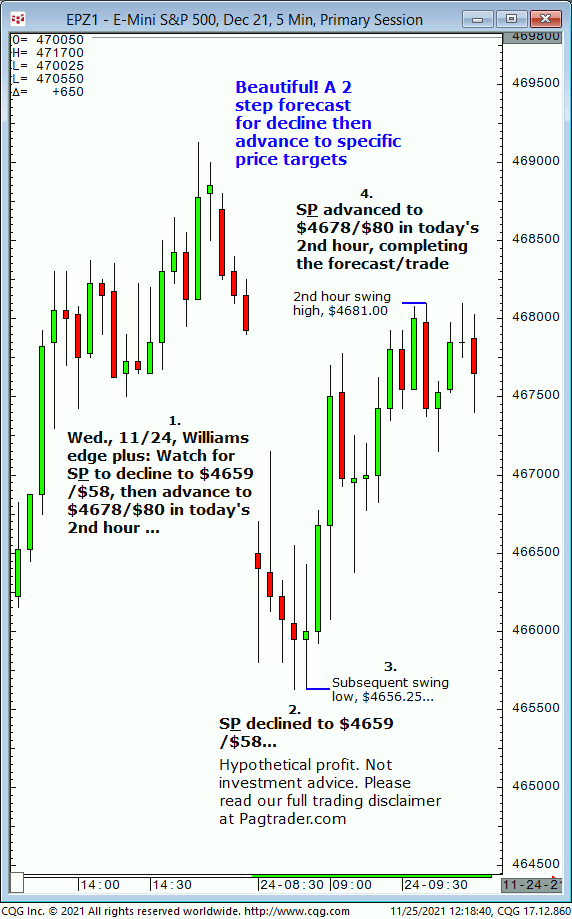 Wed.,11/24:, Watch for S&P to decline to $4659/$58, then advance to $4678/$80 into today’s 2nd hour. Result? S&P declined to $4659/$58 then advanced to $4678/$80 in the 2nd hour!