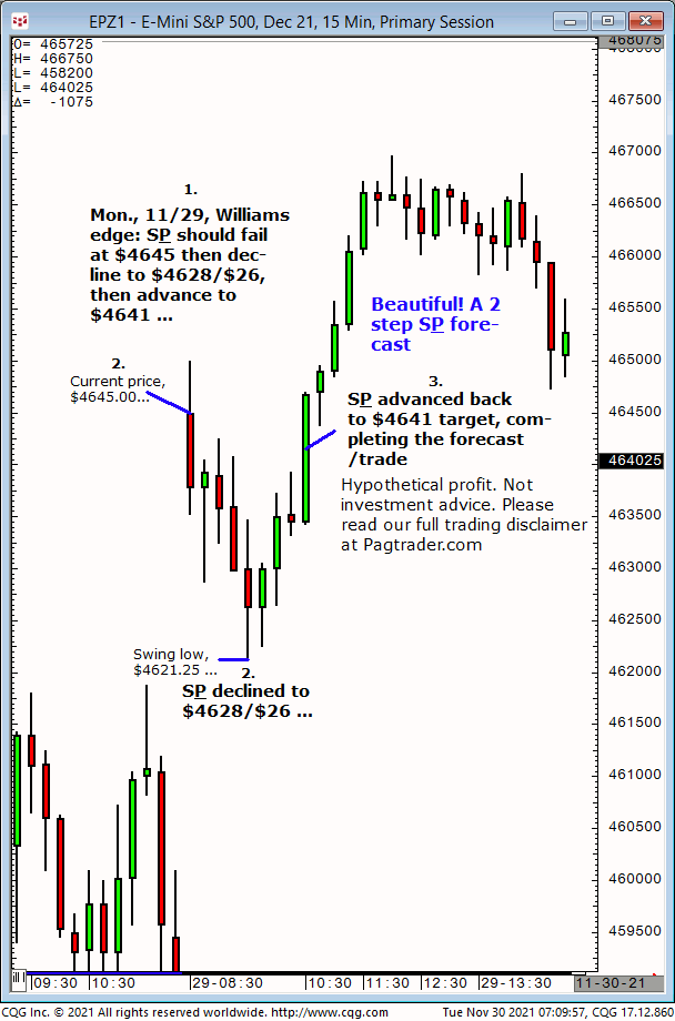 Mon.,11/29: S&P should fail at $4645 then decline to $4628/$26, then advance to $4641. Result? S&P failed at $4645, declined to $4628/$26 and then advanced to $4641!