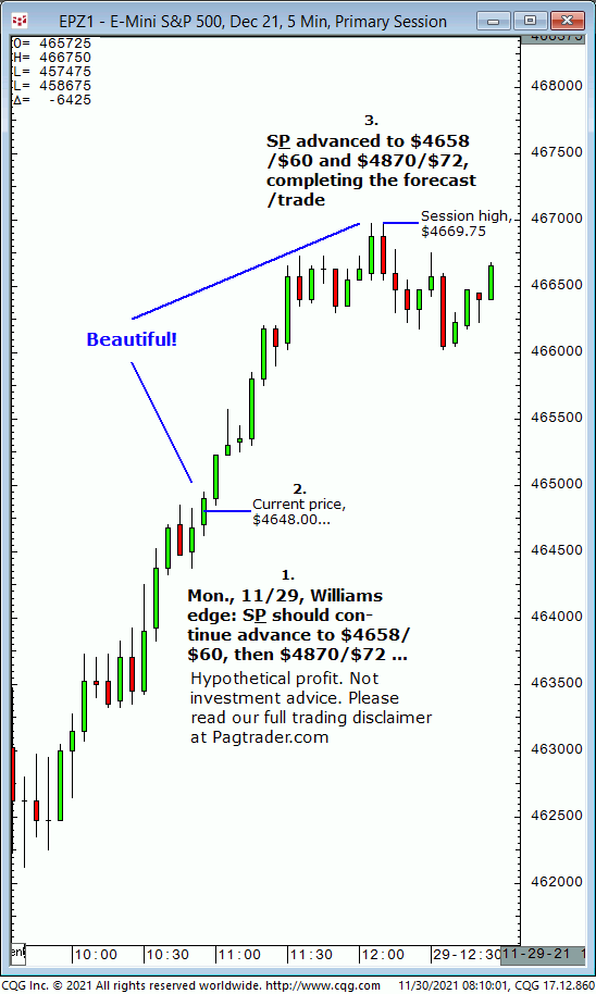 Mon., 11/29: S&P should continue advance from $4648.00 to $4658/$60, then $4870/$72. Result? The S&P advanced to $4870/$72 (swing high, $4869.75)!