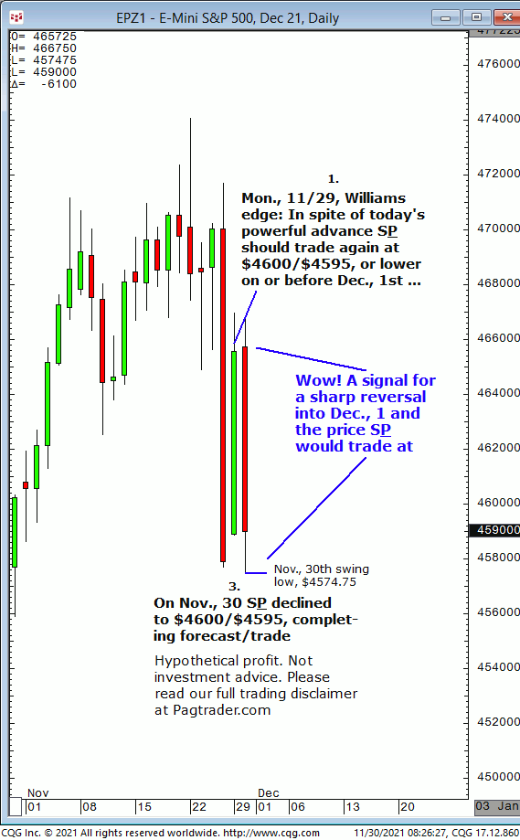 Mon., 11/29: In spite of powerful advance, S&P should trade at $4600/$4595, or lower on or before Dec., 1st. Result? S&P declined sharply on Nov., 30 completing $4600/$4595.00 target!