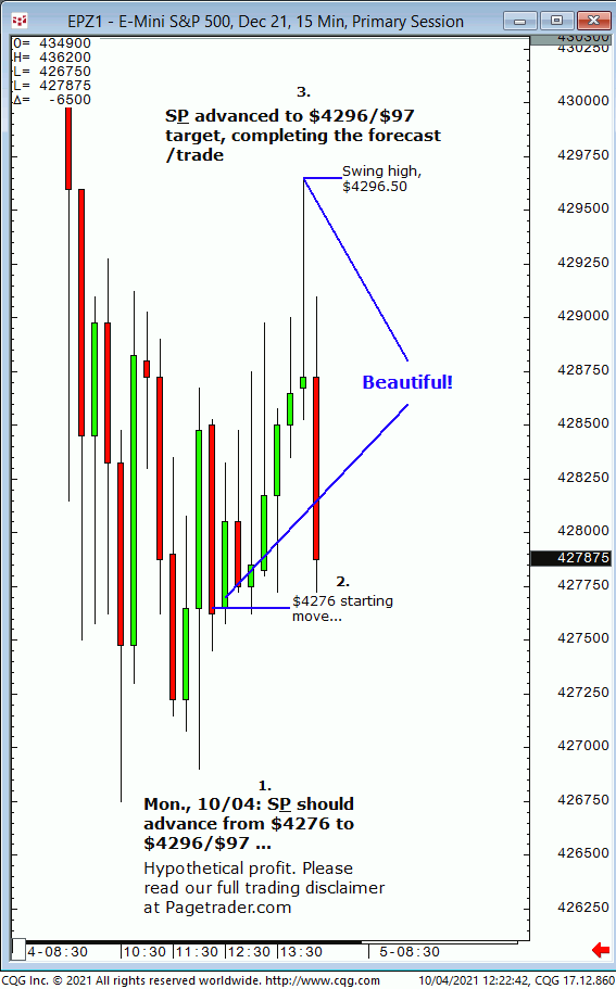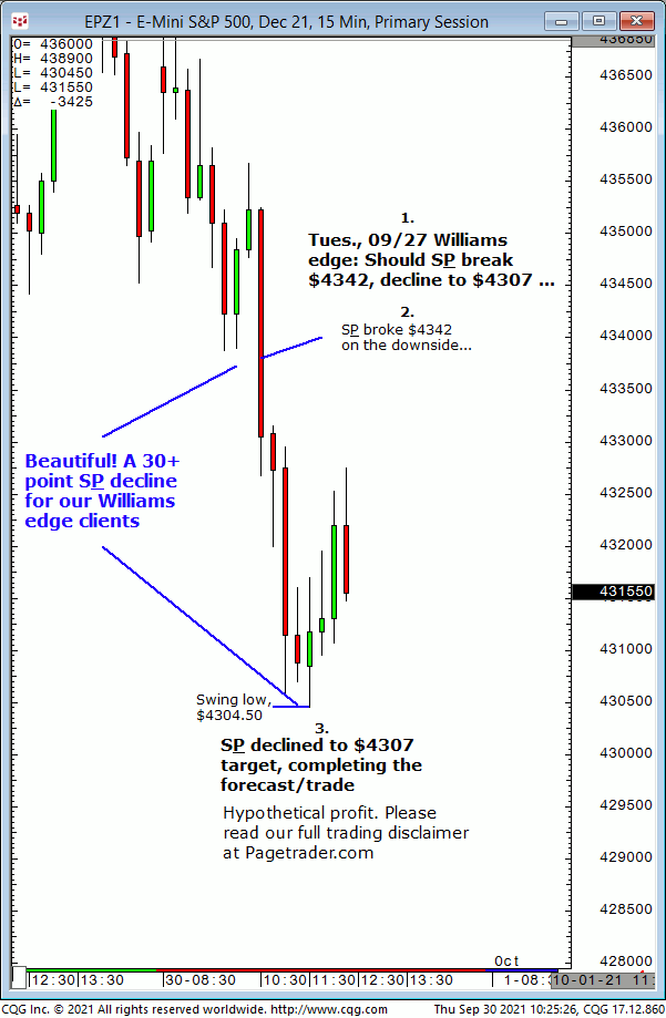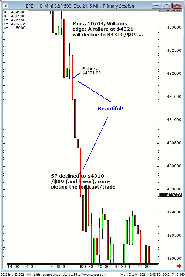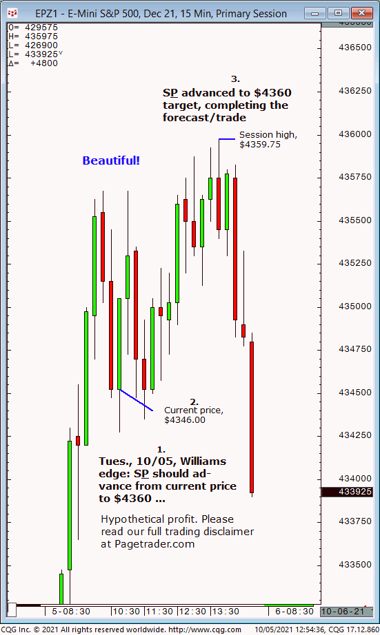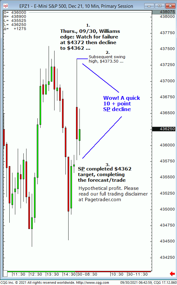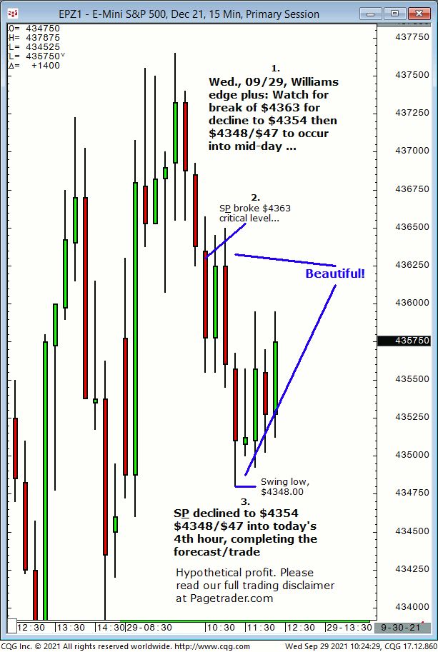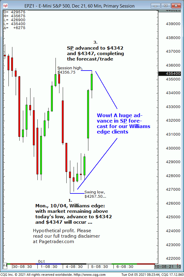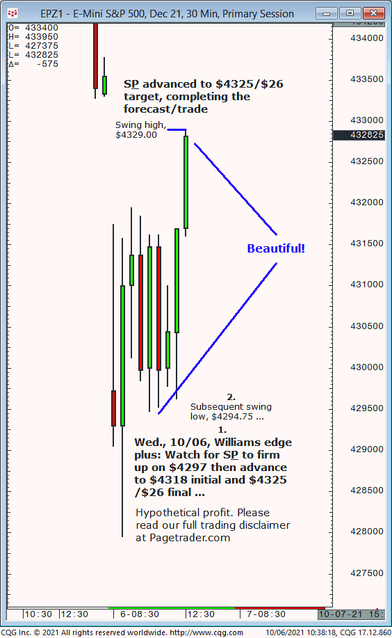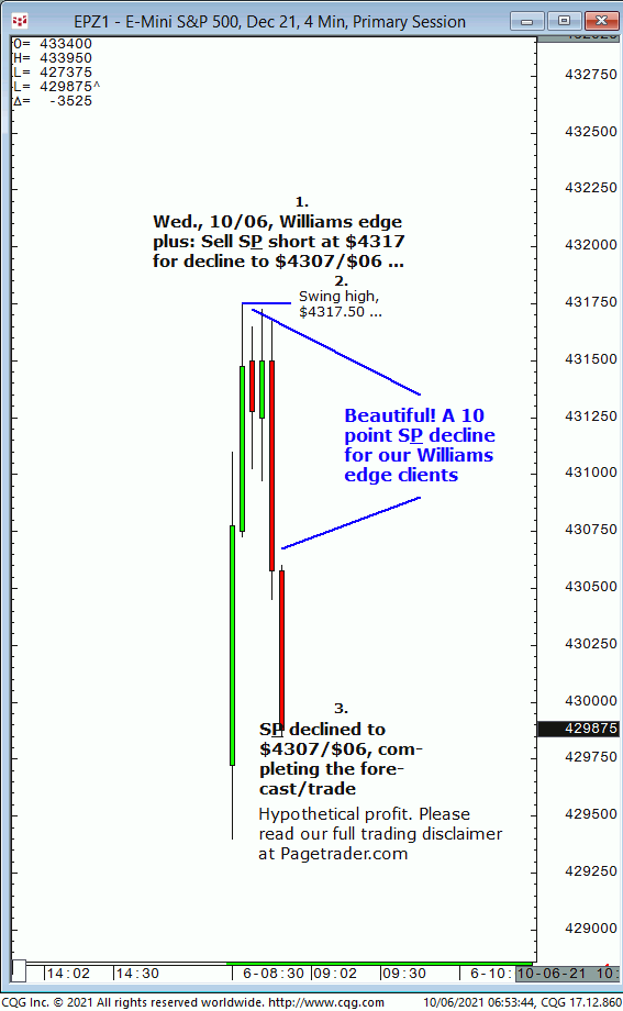 Wed., 10:06 forecast: Watch for S&P to firm up on $4297 then advance to $4318 and $4325/$26. Results? The S&P tested $4297 then reversed and completed $4325/$26! Trial at: https://pagetrader.com/market-forecasting-products/williams-edge-futures-and-plus-1-week-trial/