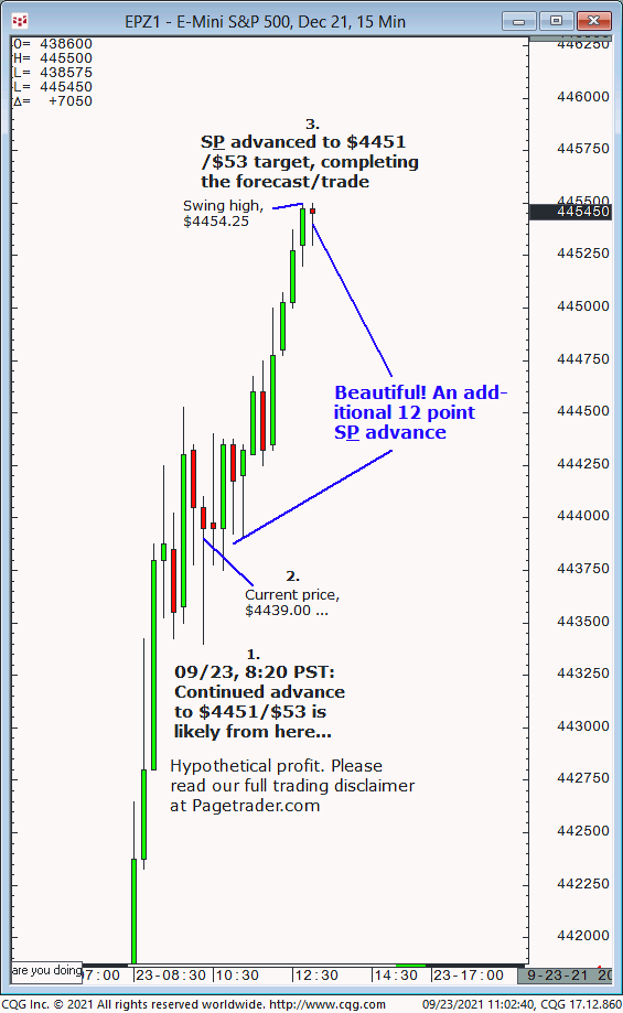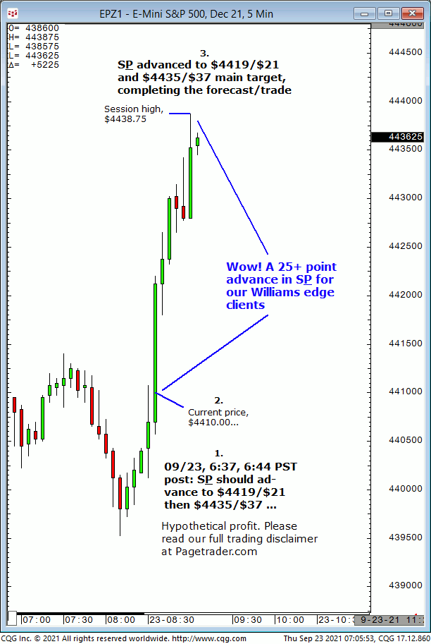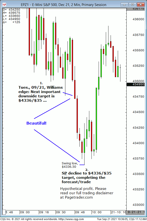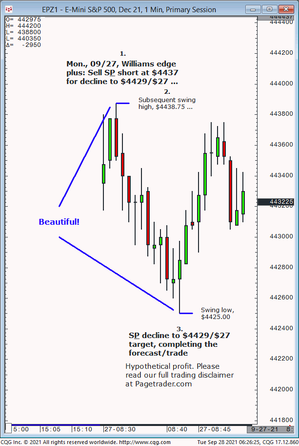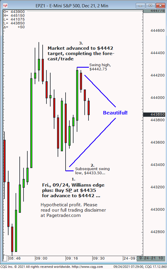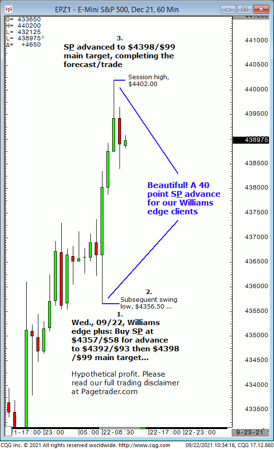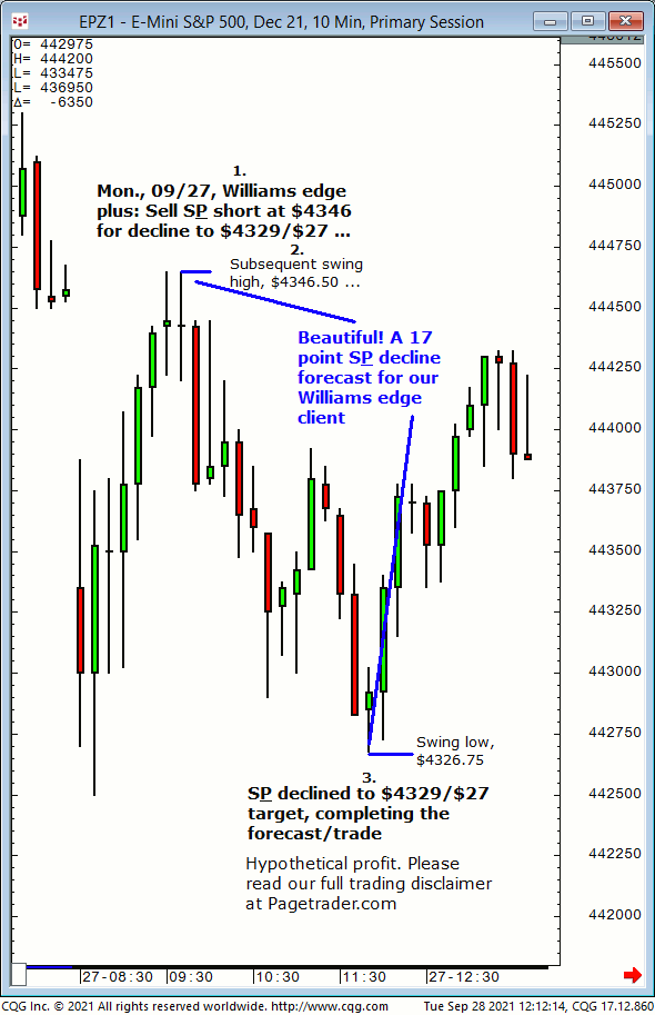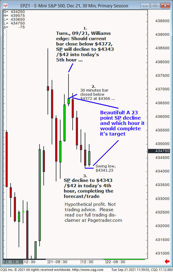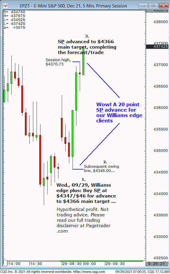 09/29: Buy S&P at $4347/$46 for advance to $4366 main target. Result? The S&P made a subsequent swing low of $4346 then quickly completed $4366 target! Trial at: https://pagetrader.com/market-forecasting-products/williams-edge-futures-and-plus-1-week-trial/