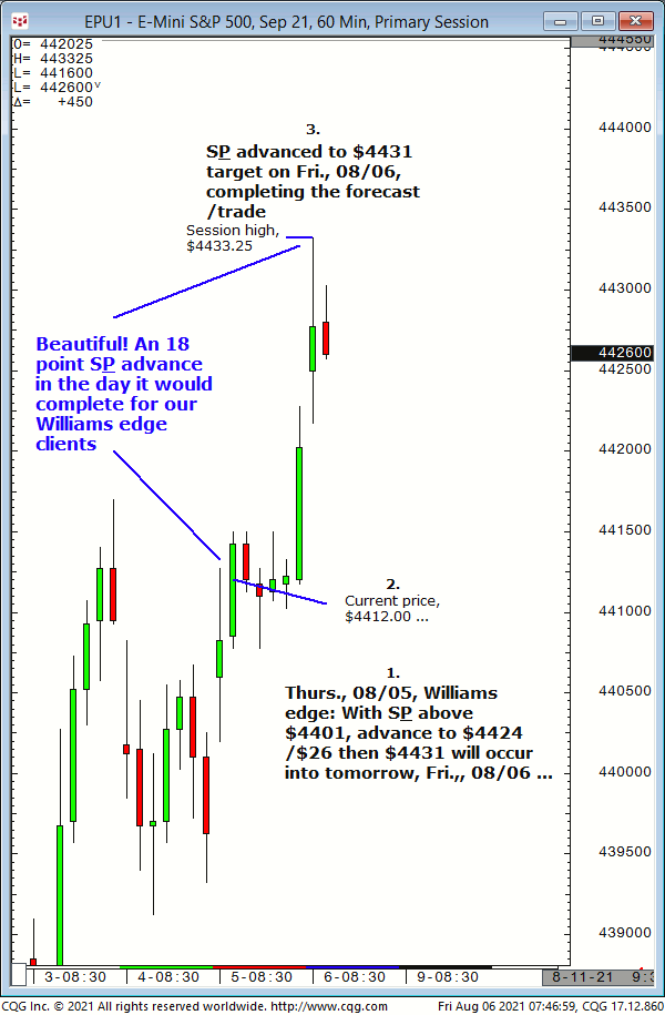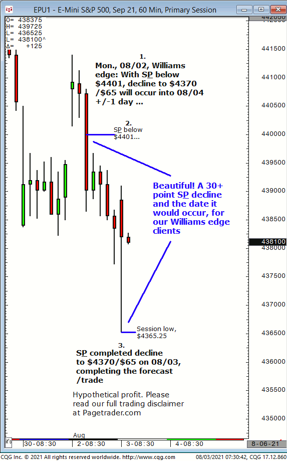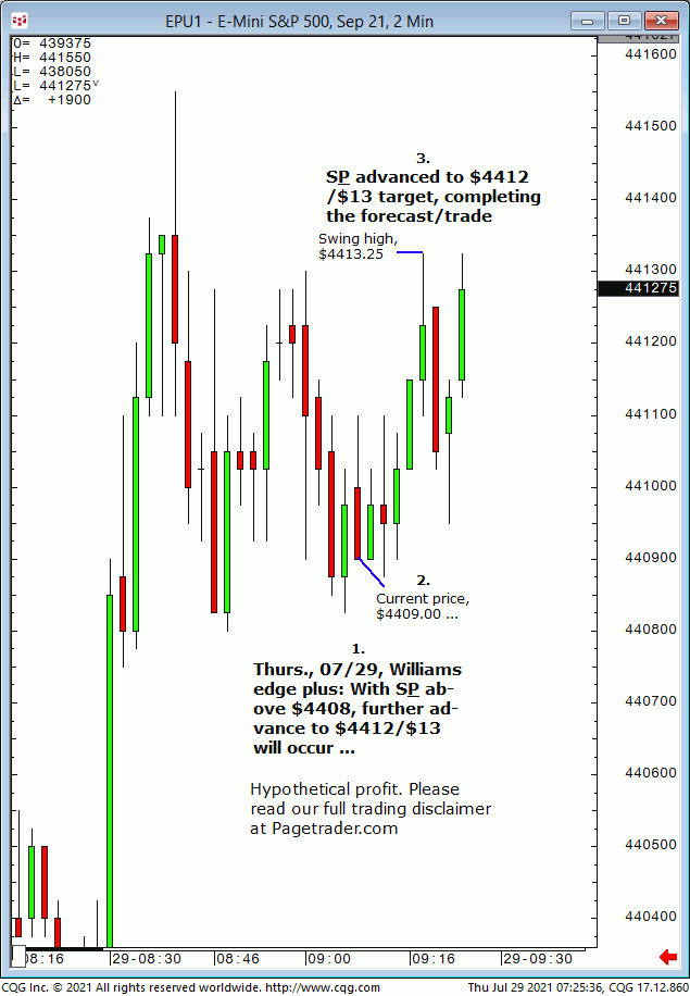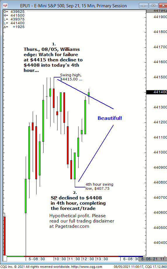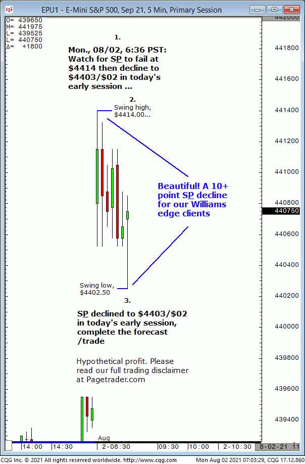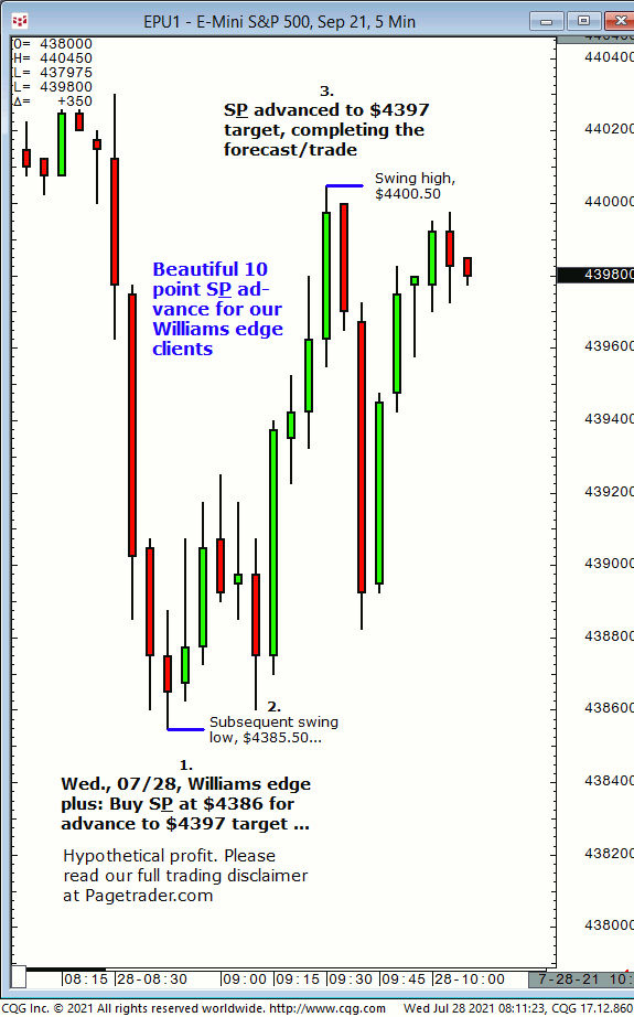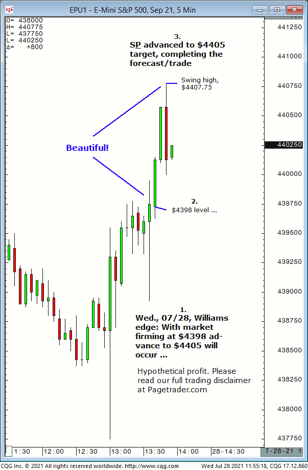 Today’s first S&P call was for new long entry at $4421/$20 for advance to $4428/$29. Results? The S&P made a swing low of $4418.25 then completed the $4428/$29 target! Trial at https://pagetrader.com/market-forecasting-products/williams-edge-futures-and-plus-1-week-trial/
