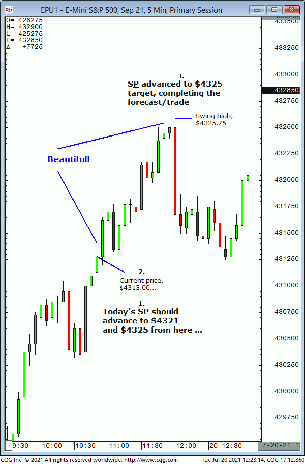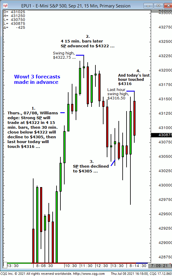 Today’s 3 step forecast was for advance from $4313 to $4322 in 4 15 min. bars, then decline to $4305, then last hour to touch $4316. Results? All three forecasts completed!