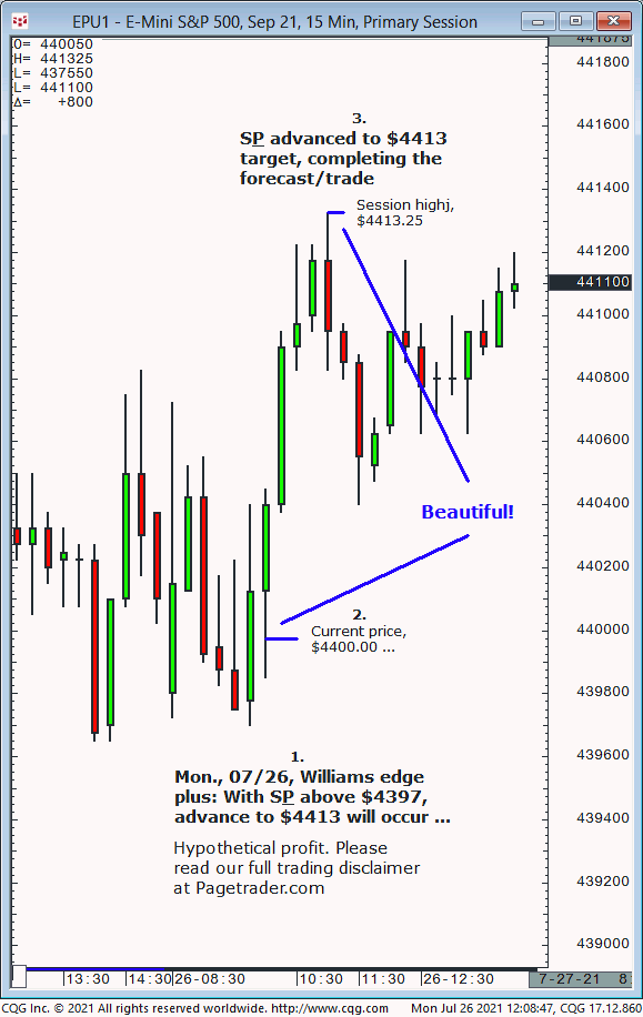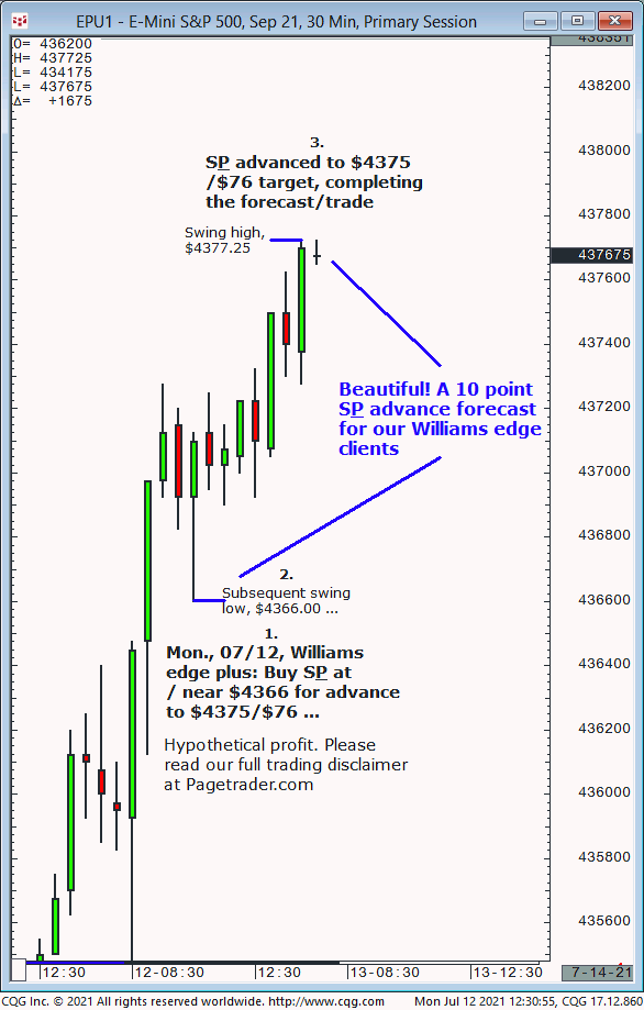 With S&P at trading at$4369 our Mon., 07/12 S&P forecast was for advance from $4369.02 $4382/$83 into 07/13. Results? The S&P advanced and today (07/13) completed the $4282/$83 target (session high, $4383.75)!