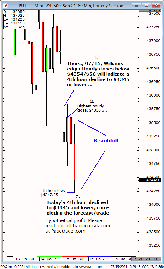15 min. after today’s open, our forecast was hourly closes below$4354/$56 would decline to $4345 or lower into 4th hour. Result? Peak hourly close was $4346, then market declined to $4345 and lower in 4th hour!