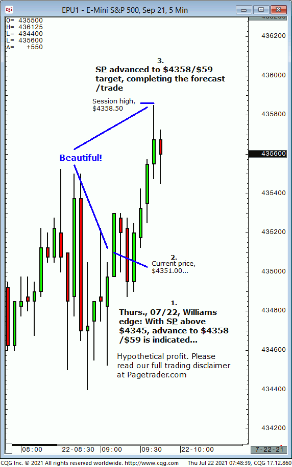 With S&P trading at $4338, our forecast was for continued advance to $4348/$49. Result? The S&P slowly advanced and completed the $4348/$49 target (session high, $4348.75)!