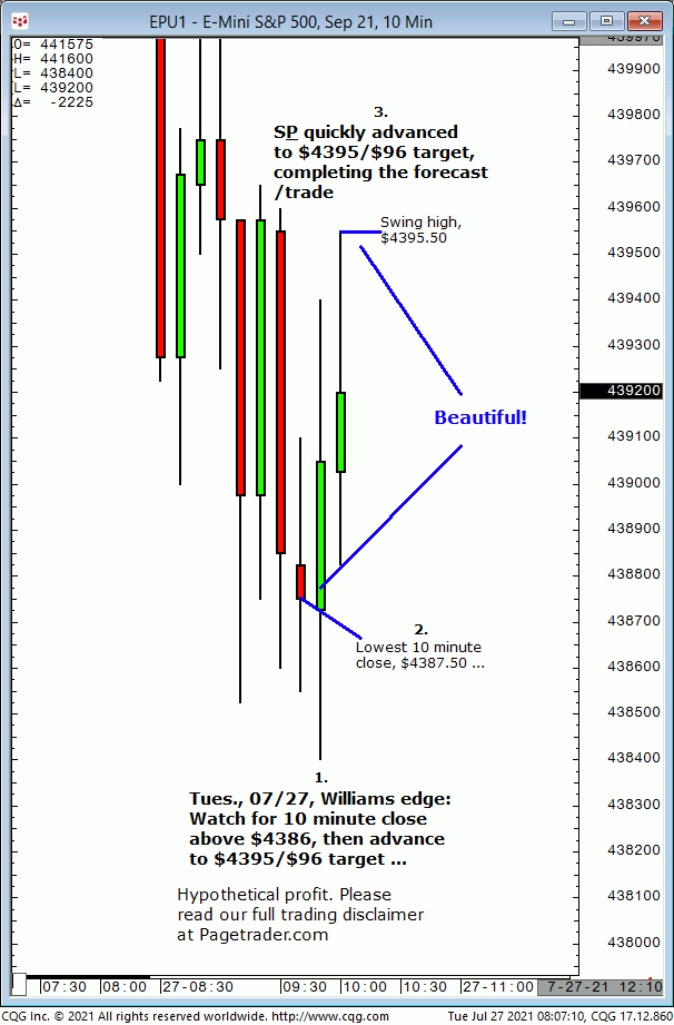 Today’s first S&P forecast was that 10 minute closes above $4386 would indicate advance to $4395/$96. Results? The S&P tested closed above $4386 then quickly advanced to the $4395/$96 target (swing high, $4395.50)!