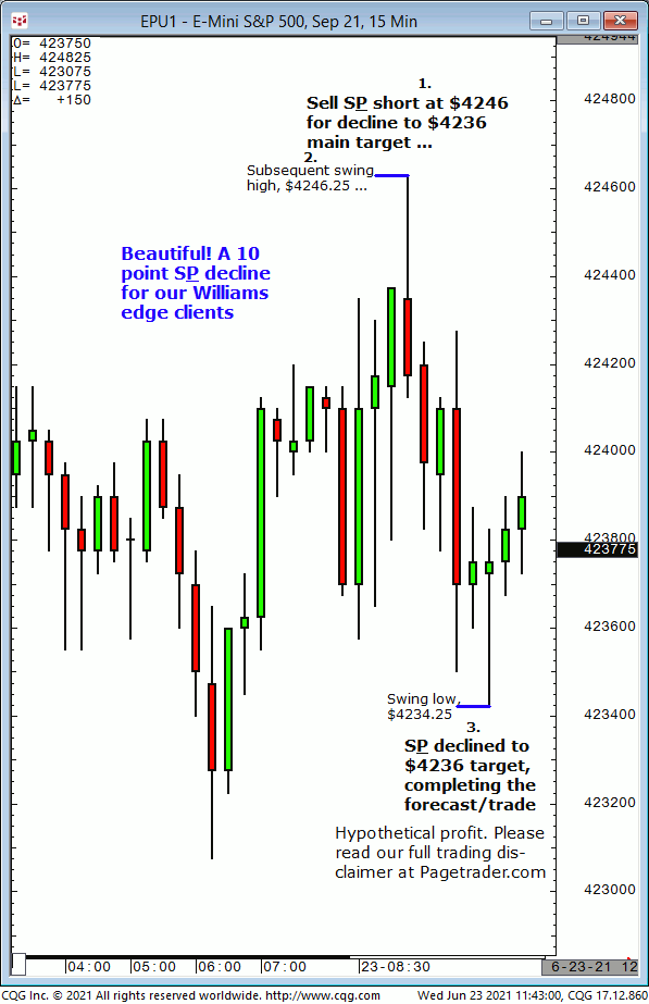 Today’s first S&P forecast indicated new short entry at $4246 for decline to $4236 and target. Results? The S&P made a subsequent swing high of $4246.25 then declined to the $4236 target!