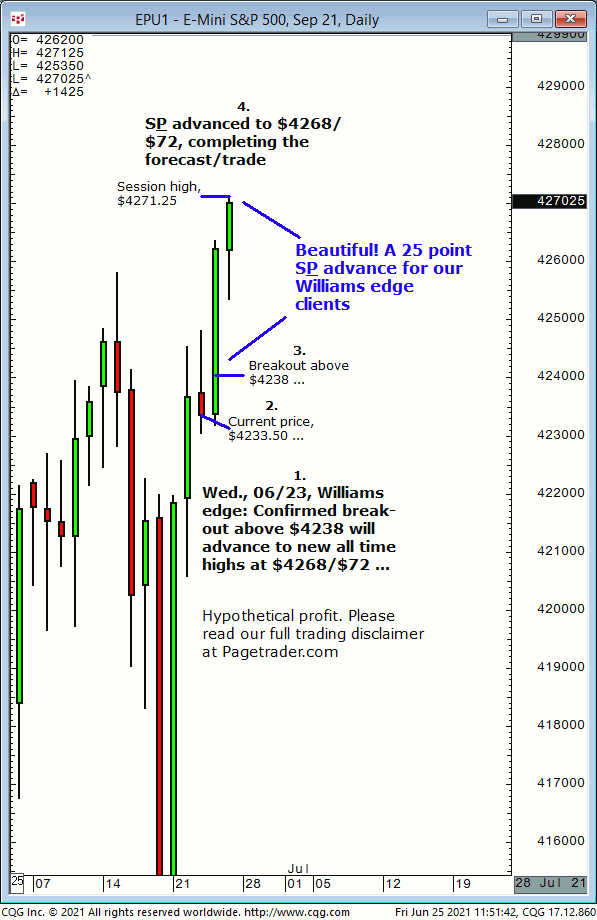 Our Wed., 06/23 S&P forecast was for breakout above $4238 then advance to $4268/$72. Results? The S&P broke out above $4238 and today completed the $4268/$72 target. David Williams alluded to this forecast on Ameritrade with Ben Lichtenstein on 06/23. https://tdameritradenetwork.com/video/rB4A-Ho9H8uBej5s4EYADg