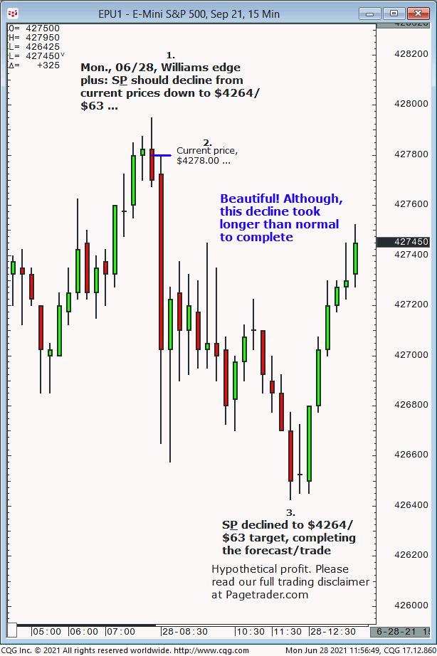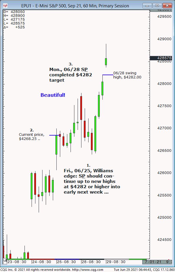 With S&P trading at $4268, our Fri., 06/25 forecast was for continued advance to $4282 or higher, expected into early this week. Results? On Mon., 06/28 the S&P completed the $4282 target (session high, $4282.00!