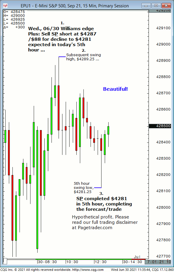 Early today, our S&P forecast was for new short entry at $4287/$88, for decline to $4281, due in today’s 5th hour. The market then declined to the $4281 target in today’s 5th hour (5th hour swing low, $4281.25)!