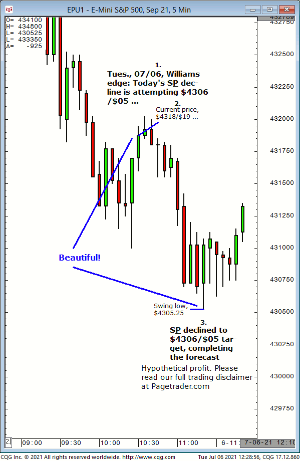 With today’s S&P at $4318/$19, our forecast was that continued decline to $4306/$05 was about to occur. Results? The S&P declined and completed the $4306/$05 target (session low, $4305.25)!