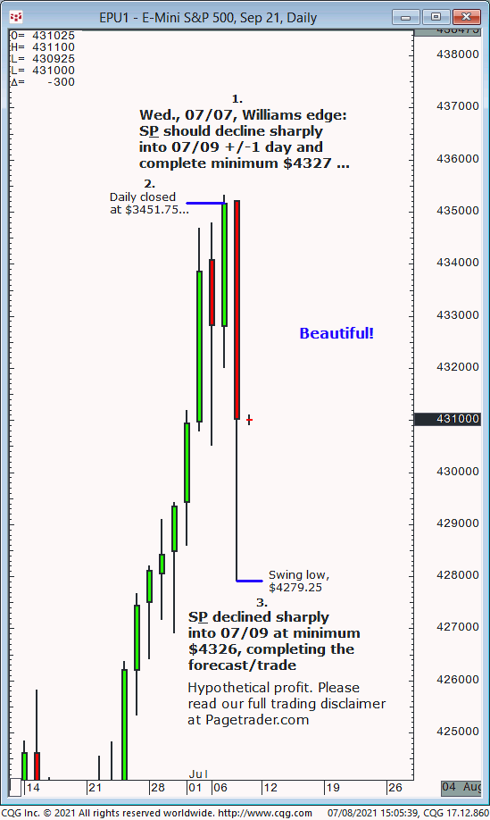 Our 07/07 S&P forecast was for sharp decline from $4351.25 to minimum $4327 target into Fri., 07/09 (+/-1 day). Results? The S&P decline sharply and today (07/08) completed the $4327 minimum and lower!