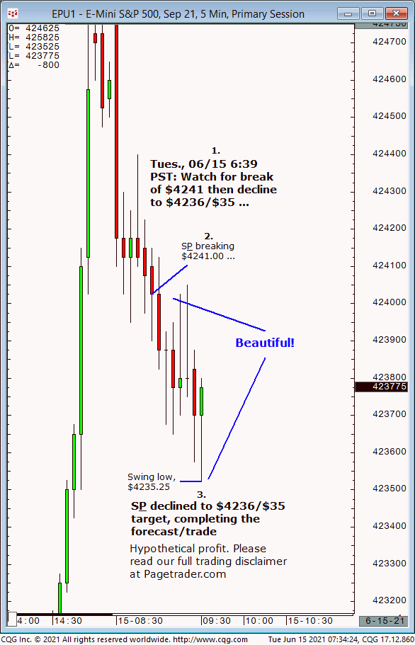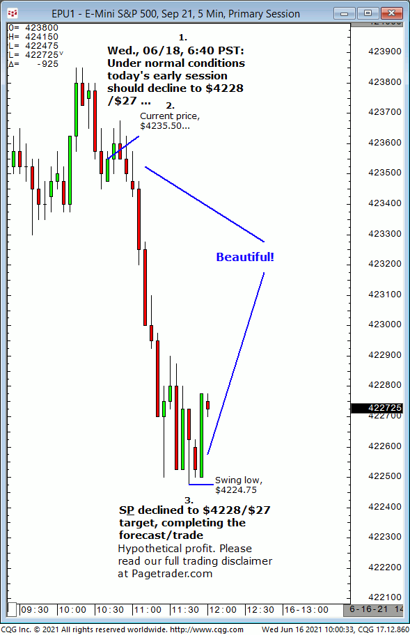 Our Wed., 06/18 6:40 PST forecast that the S&P (then trading at $4235.50) should decline to $4228/$27. Results? The S&P declined and completed $4828/$27 (swing low, $4224.75)!
