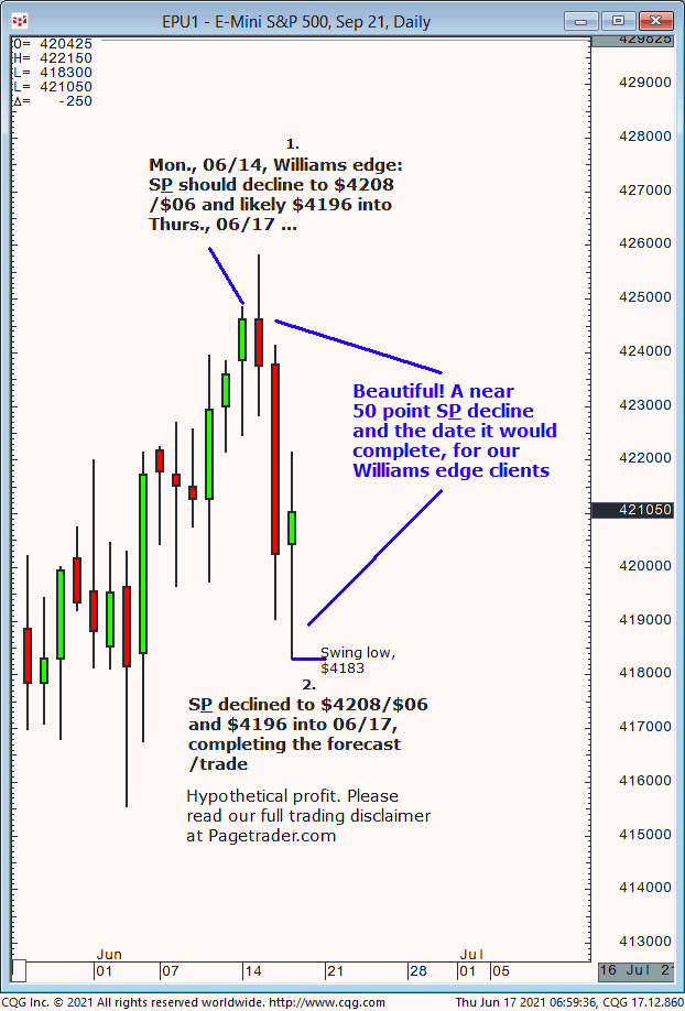Our Mon., 06/14 forecast was for a decline from the then current prices down to $4208/$06 and likely $4196, into Thurs., 06/17. Results? The S&P declined and completed the $4196 target (swing low, $4183)!