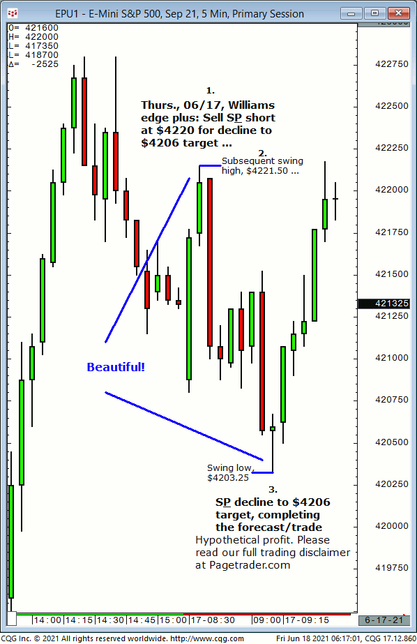 Yesterday’s (Thurs.,06/17) early session S&P forecast was for new short entry at $4220 for decline to $4206 target. Result? The S&P made a subsequent swing high of $4221.50 then completed the $4206 target (swing low, $4203.25)!