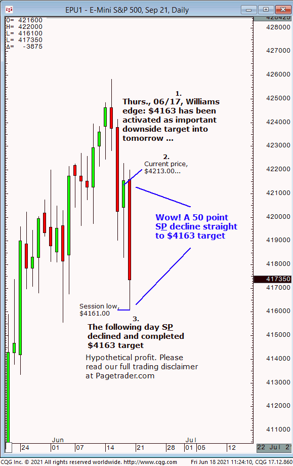Yesterday (Thurs., 06/17) we noted that $4163 was activated and would likely prompt a decline to that level into today, Fri., 06/18. Results? The S&P declined sharply today and completed the $4163 target (session low, $4161.00)!
