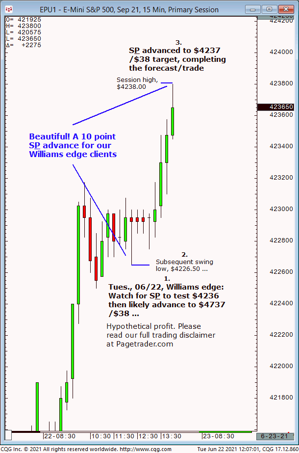Our next S&P forecast indicated a successful test of $4236 to be followed by advance to $4237/$38. Results? The S&P declined to $4236.50, then reversed and completed the $4237/$38 target (session high, $4238.00)!
