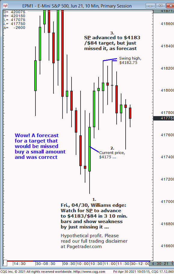 With S&P at $4175, our next forecast was for advance in 3 10 min. bars from $4175 to $4183/$84, and target to be missed by a small amount. Results? In 3 10 min. bars the S&P made a swing high of $4182.75!