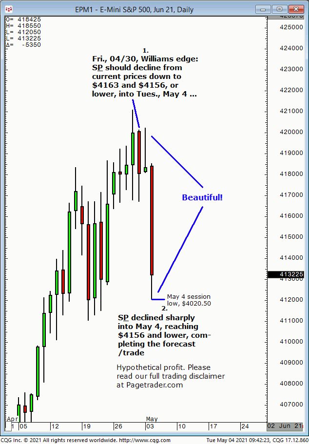 Our Fri., 04/30 S&P forecast indicated a sharp drop to $4163 and $4156 or lower into Tues., 05/04. Results? Today, 05/04 the S&P declined sharply and completed $4163, $4156 and lower, completing the forecast!