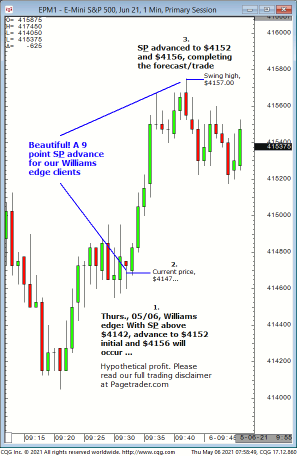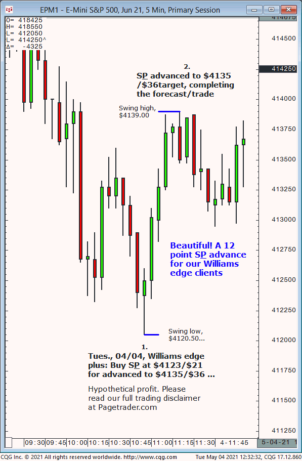 Our next S&P forecast today was for new long entry at $4123/$21 for advance to $4135/$36. Results? The S&P made a subsequent swing low of $4120.50 then completed the $4135/$36 target (swing high, $4139)!