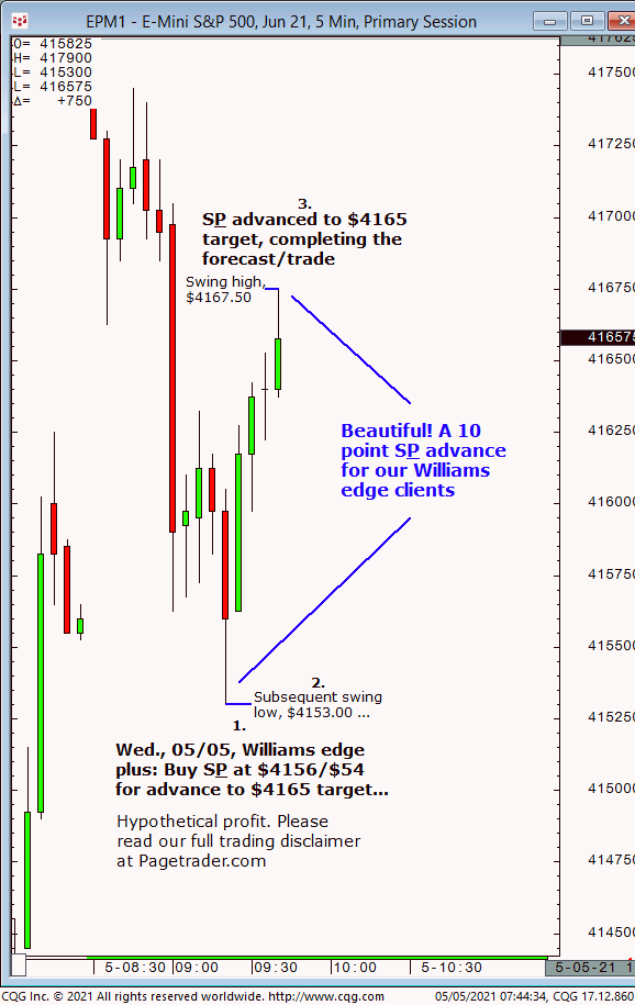 Our first S&P forecast to was for new long entry at $4156/$54 for advance to $4165 target. Results? The S&P made a subsequent swing low of $4153, then reversed and completed the $4165 target (swing high, $4167.50)!