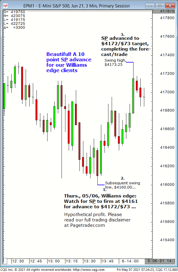 Late yesterday (05/06) our S&P forecast was for the market to reverse up at $4161 and advance to $4172/$73. Results? The S&P made a subsequent swing low of $4160 then advanced to the $4172/$73 target (swing high, $4173.25)!