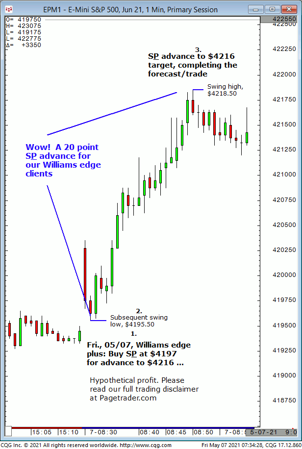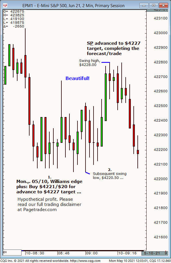 Today’s first S&P forecast indicated new long entry entry at $4192 for advance to $4199 target. Results? The S&P made a subsequent swing low of $4190, then advanced and completed the $4199 target (swing high, $4202.50)!
