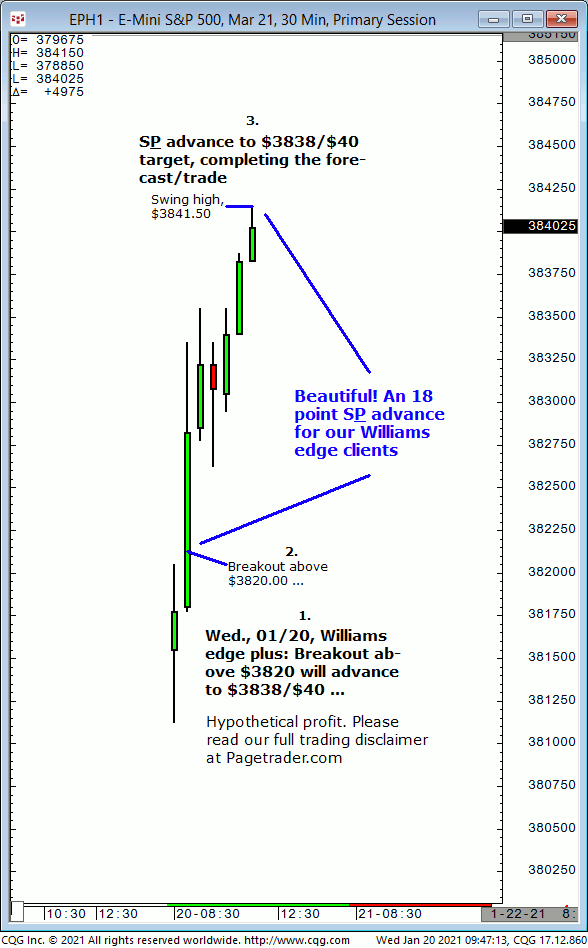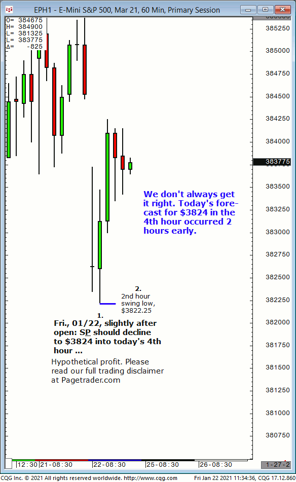 In today’s (01/20) 2nd hour, with S&P at $3832, our forecast was that the S&P should trade at $3844/$46 in today’s 5th hour. Results? The S&P advanced and in the 5th hour made a swing high of $3847.25!