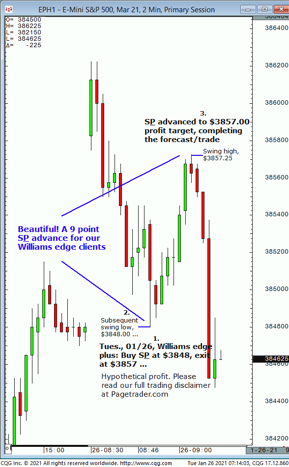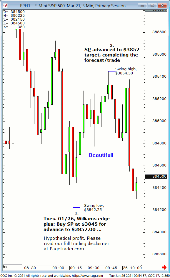 Today’s next S&P forecast indicated new long entry at $3845 for advance to $3852 target. Result? The S&P made a subsequent swing low of $3842.25, then sicknessescompleted the $3852 target (swing high,$3854.50)!