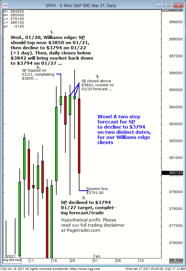Our Wed., 01/20S&P call was for top on 01/21 at/near $3850, then decline to $3794 into 01/22 (+1 day). Then, daily closes below $3842 for 2nd decline to $3794 on 01/27. Check out the results!