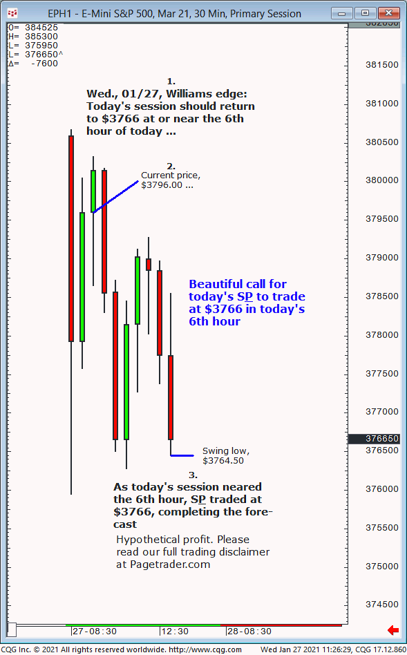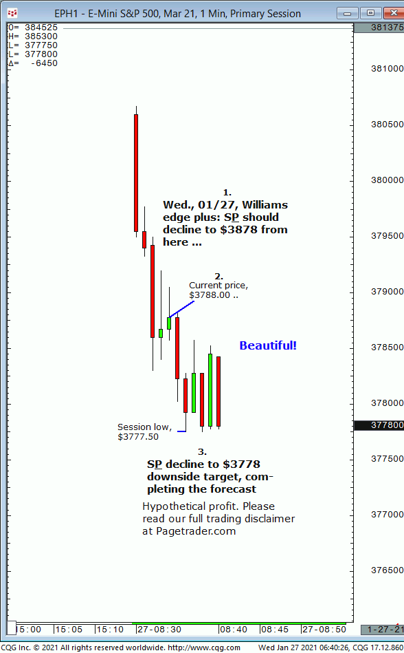 Last Wed., 01/20, we forecast a top to occur on Thurs., 01/21 to be followed by decline to $3794 into Fri., 01/22 +1 day. Results? The S&P topped on 01/21 and today completed $3794 downside target (session low, $3780.50)!