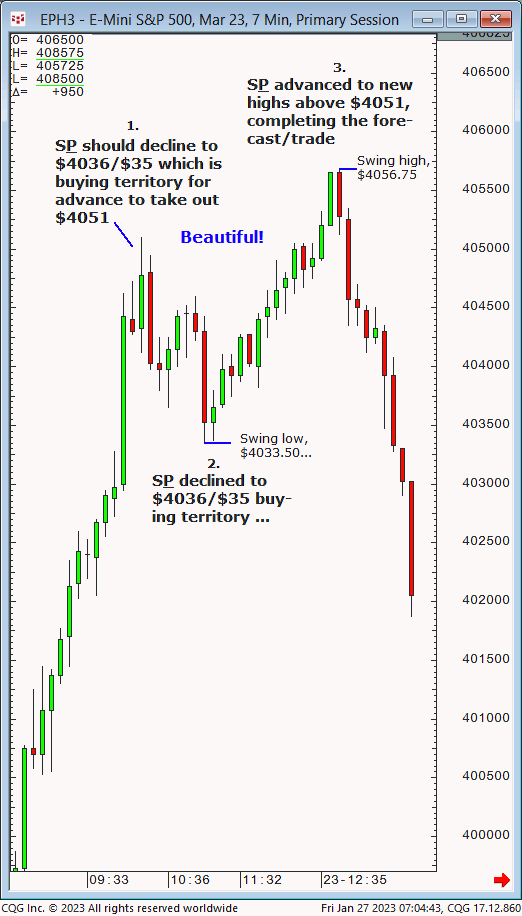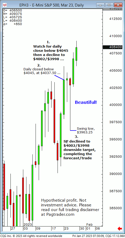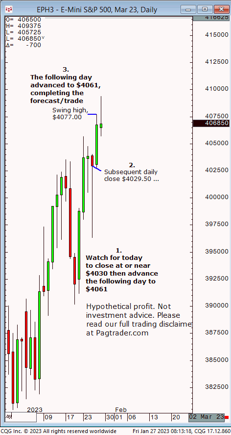 Thurs., 01/12: Buy any pullback to $3964/$63 for advance to $3996/$97. Result? The S&P pulled back to $3964/$63 (swing low, $3957.25) then advance powerfully to $3996/$97!