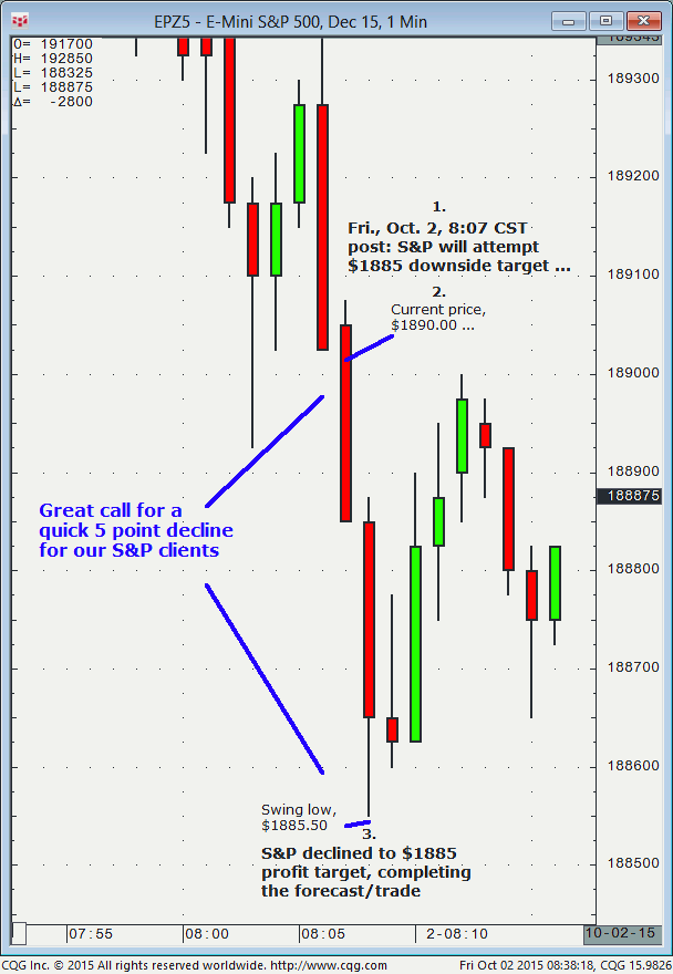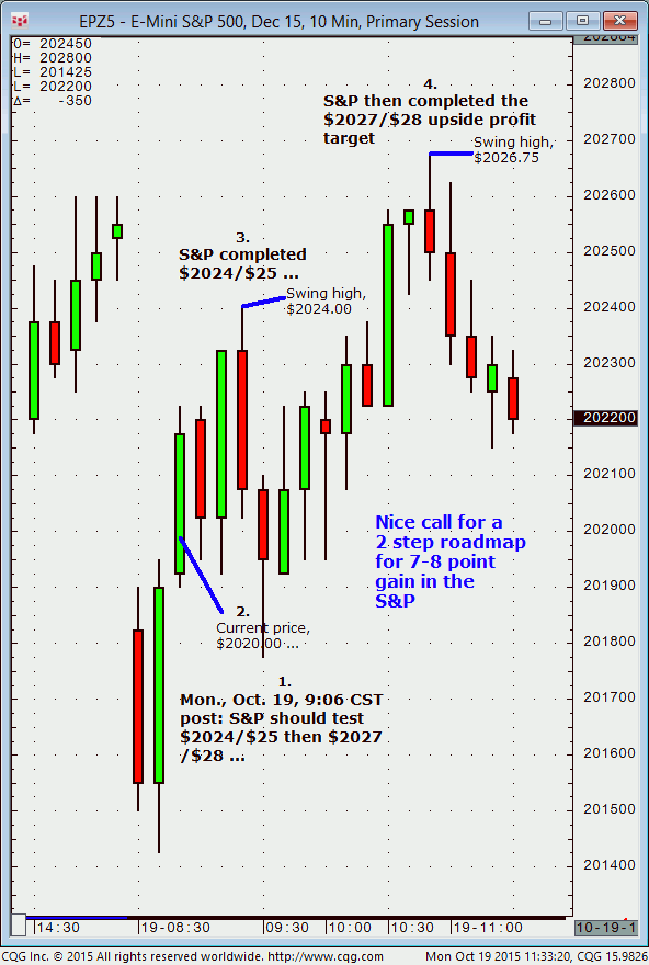 December S&P: 1. In today’s (Monday, October 19) live S&P window 9:06 CST post it was noted that the December S&P was expected to advance from the then current price (approximately $2020) up to $2024/$25, then $2027/$28. 2. Subsequently, the December S&P advanced to $2024/$25 (swing high, $2024.00) and reacted off that level. Shortly thereafter […]