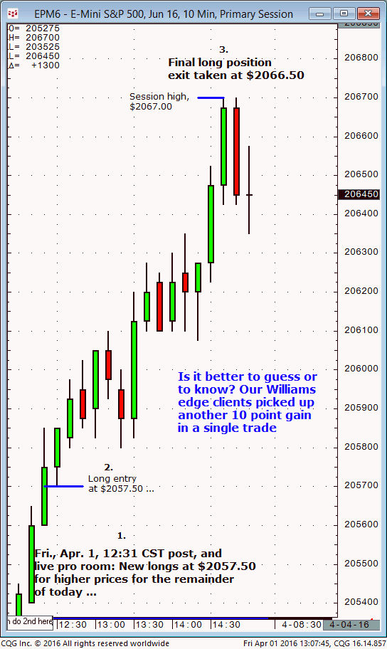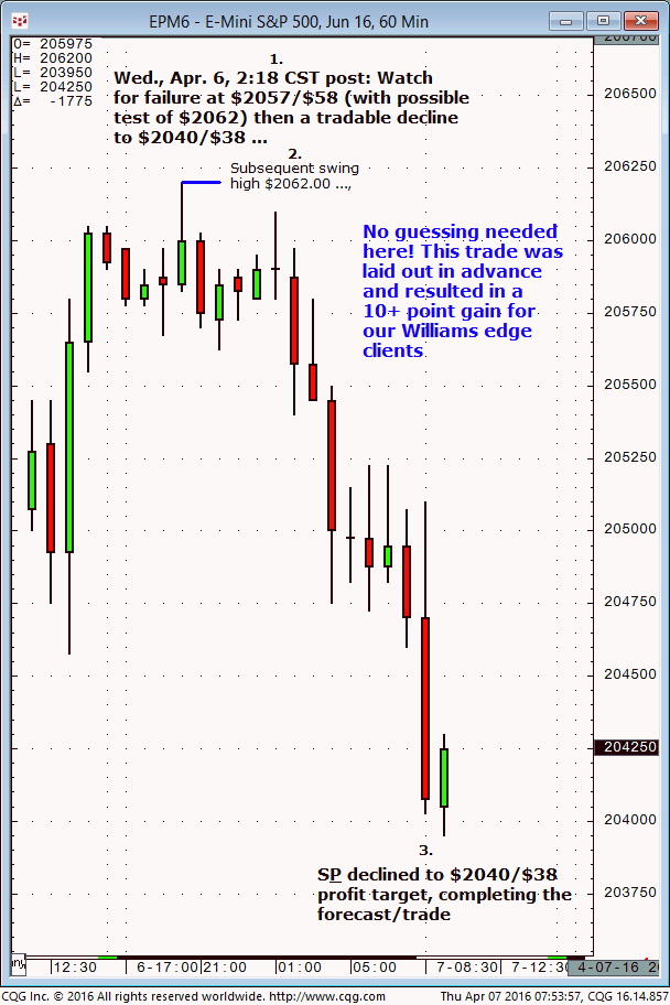 June S&P: 1. In today’s (Friday, April 29) Williams edge Pro and live messenger it was noted that the June S&P (then trading at approximately $2054) should fail at/near $2060 for a tradable decline down to $2046. 2. Subsequently, the June S&P advance to a swing high of $2057.25 then reversed sharply lower and completed […]